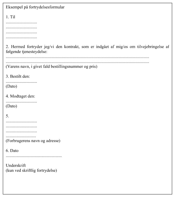Eksempel på fortrydelsesformular iht.bilag 2 til artikel 246a § 1 stk. 2 s. 1 nr. 1 og § 2 stk. 2 nr. 2 i EGBGB (Einführungsgesetz zum Bürgerlichen Gesetzbuch, tysk lov med overgangsforskrifter, regler om forholdet til anden tysk lovgivning samt regler om tysk international privatret)